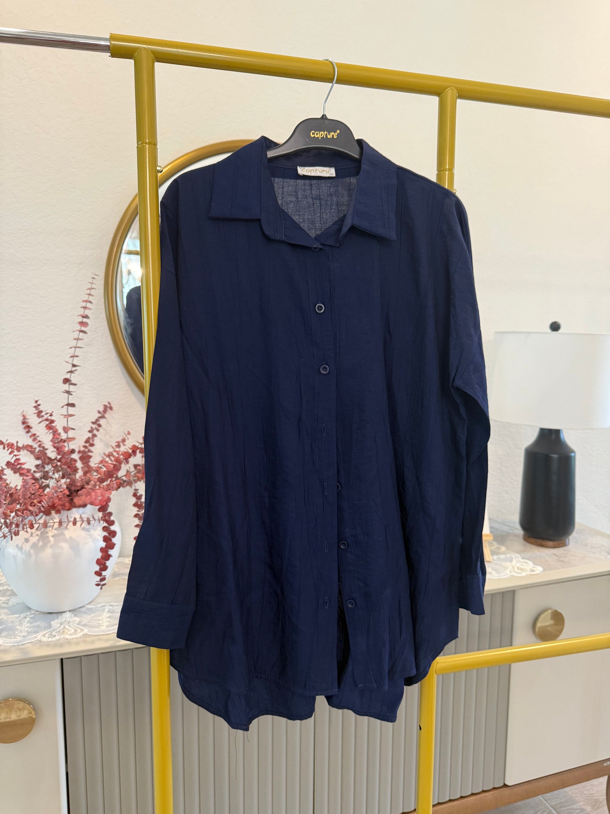A classic longline button-down shirt in deep navy blue, perfect for versatile modest styling.