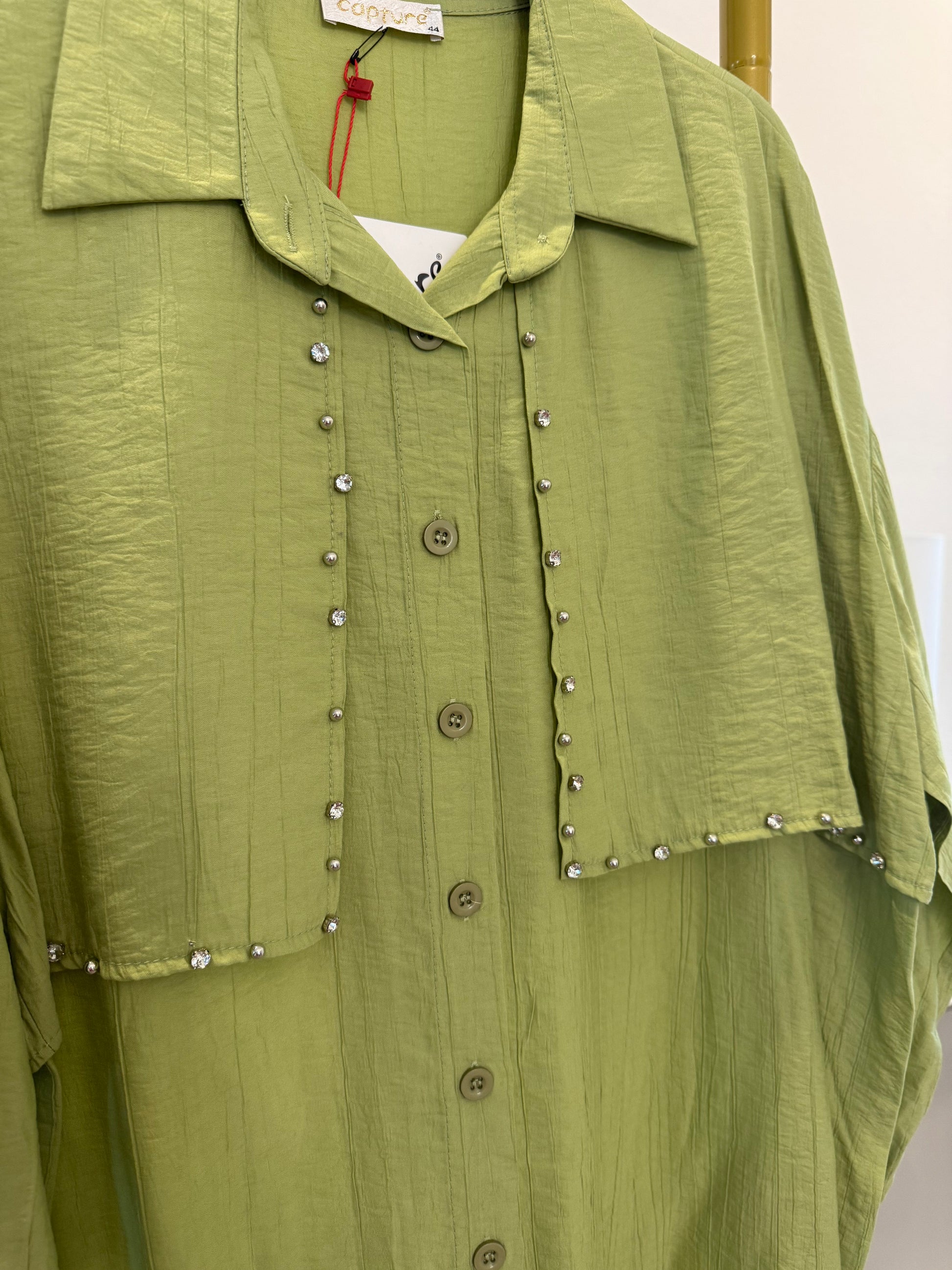 A longline button-down tunic shirt in a fresh green shade with stylish stud detailing.