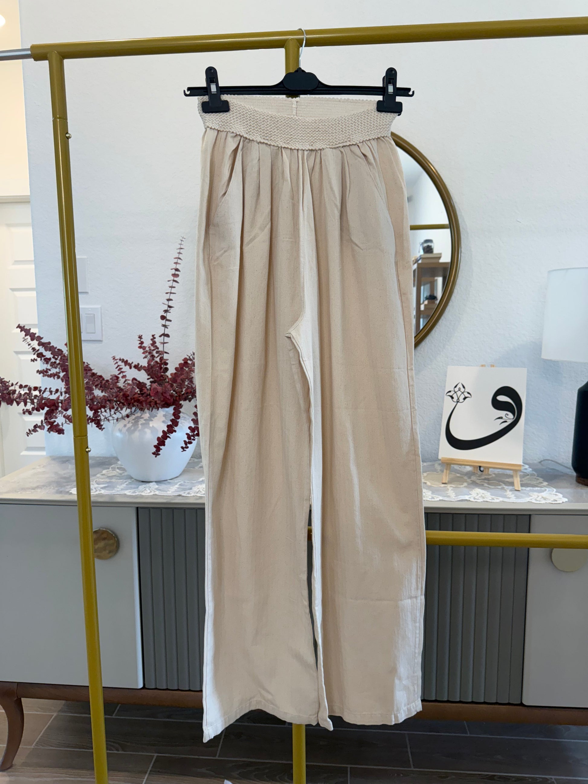 Beige Wide-Leg Pants with Smocked Waist
