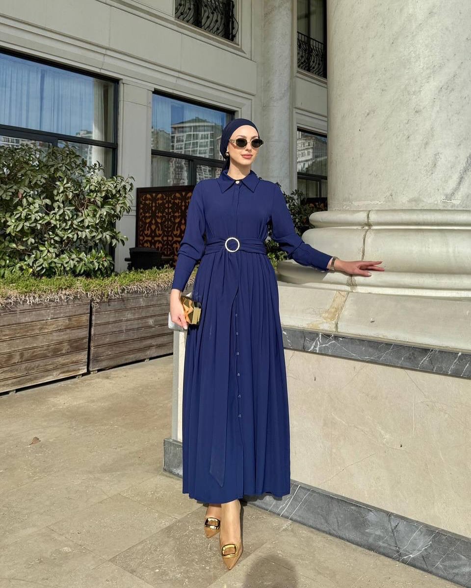 A perfect blend of modesty and modern chic, this shirt dress is designed with elegance and comfort in mind. Featuring a classic shirt collar, button-down front, and a waist-defining belt with a silver ring detail, it creates a flattering silhouette while maintaining a timeless style. The pleated flow adds grace and movement, making it versatile for both casual and formal wear.