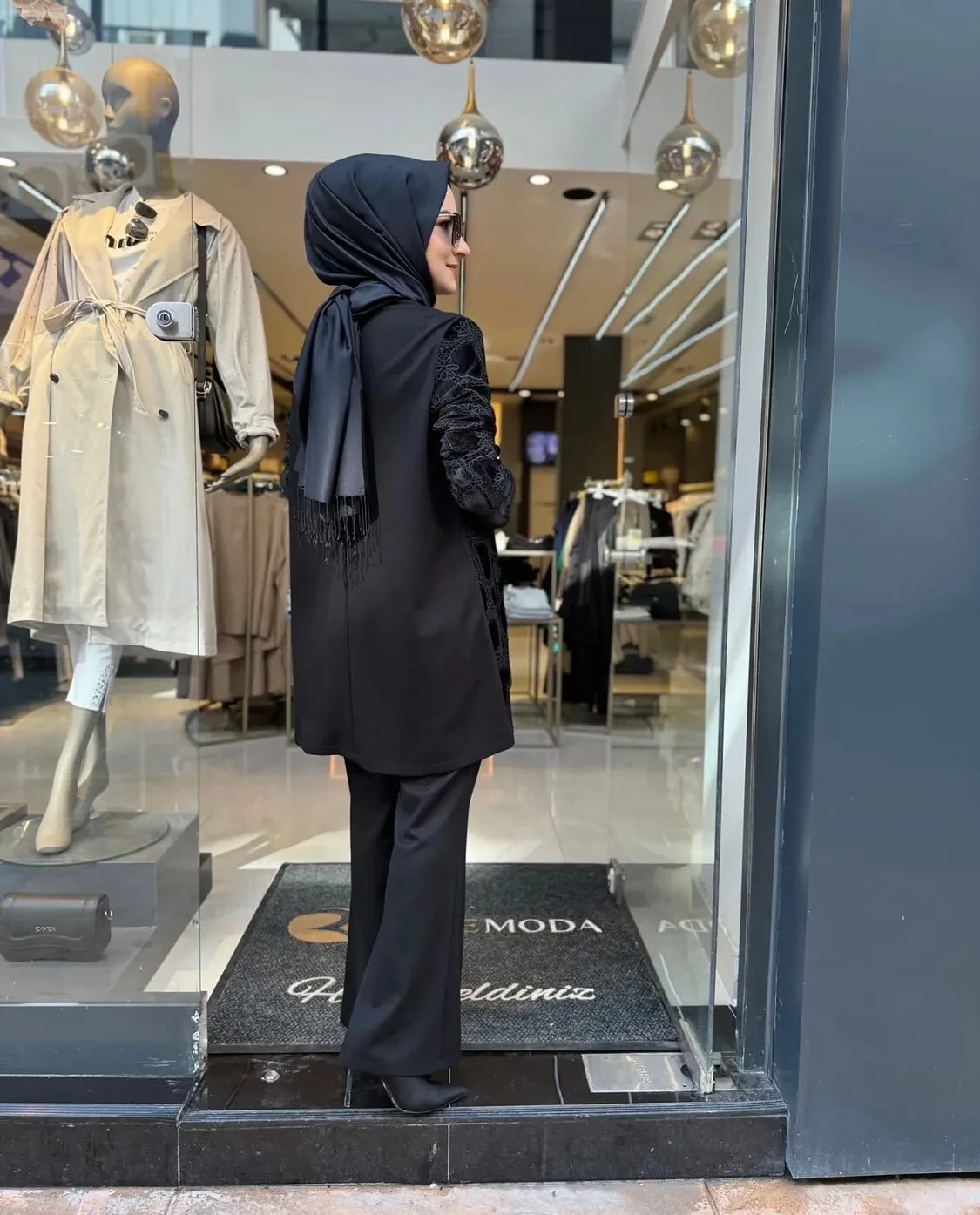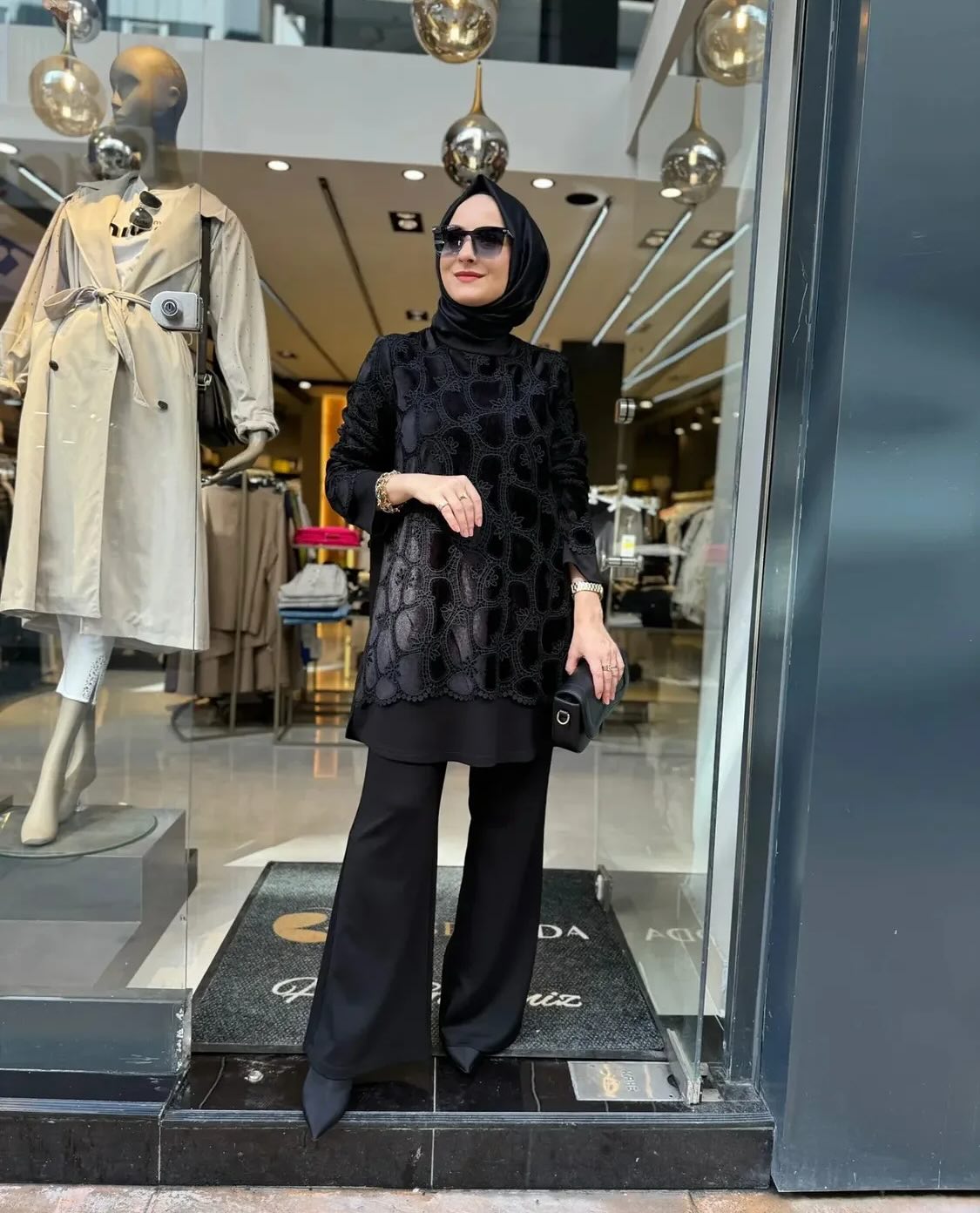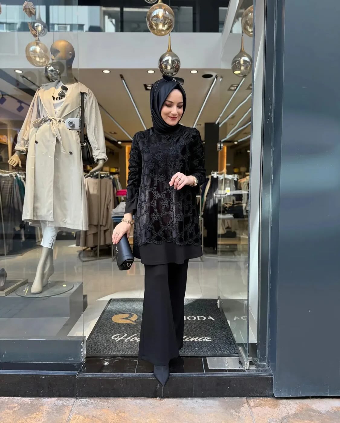 Step out in timeless elegance with this stunning all-black two-piece set. The top features a long tunic with a delicate lace overlay that adds texture and sophistication, paired with wide-leg trousers for a flowy, comfortable fit. Styled with a sleek satin-effect hijab, this look is the perfect balance of modesty and modern chic.