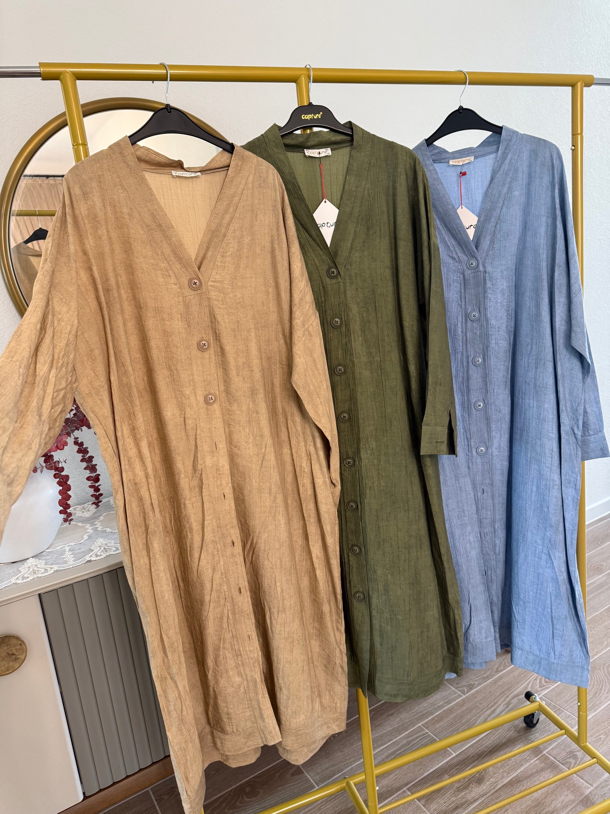 Button-down linen maxi dress in earthy and soft tones, designed for effortless everyday wear.
