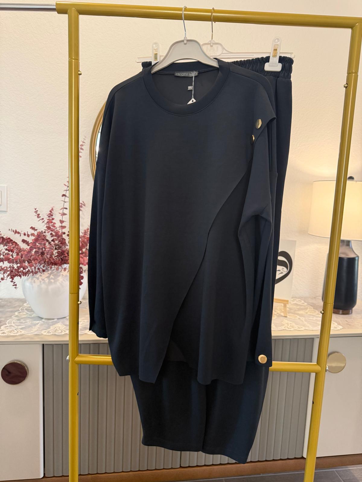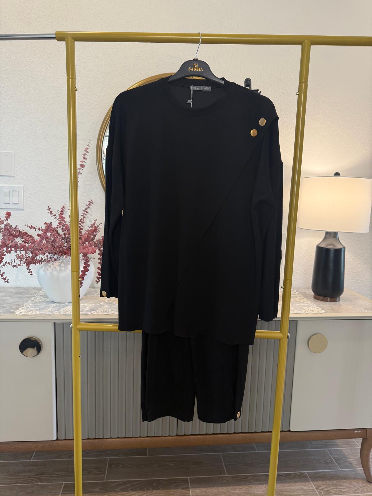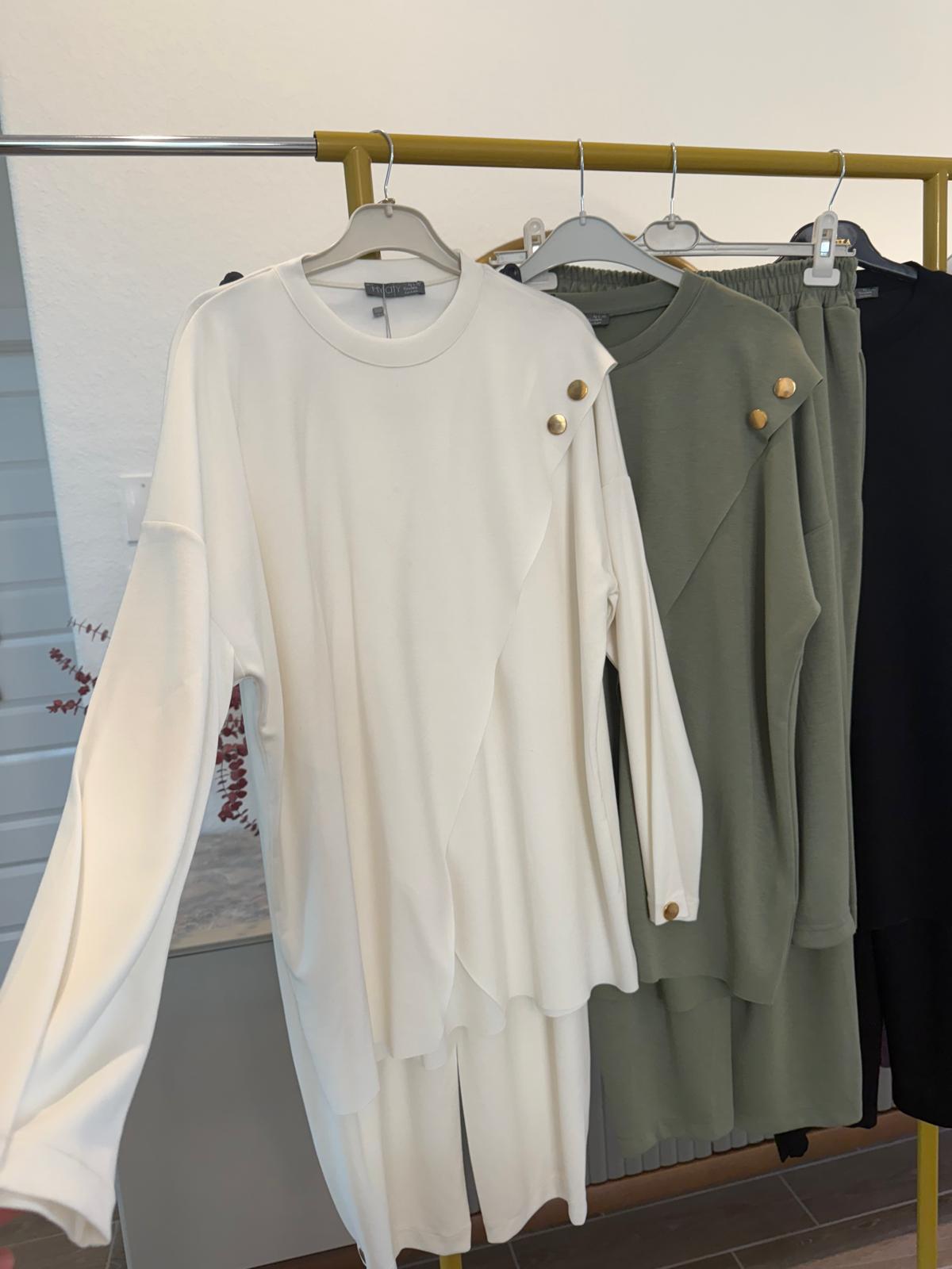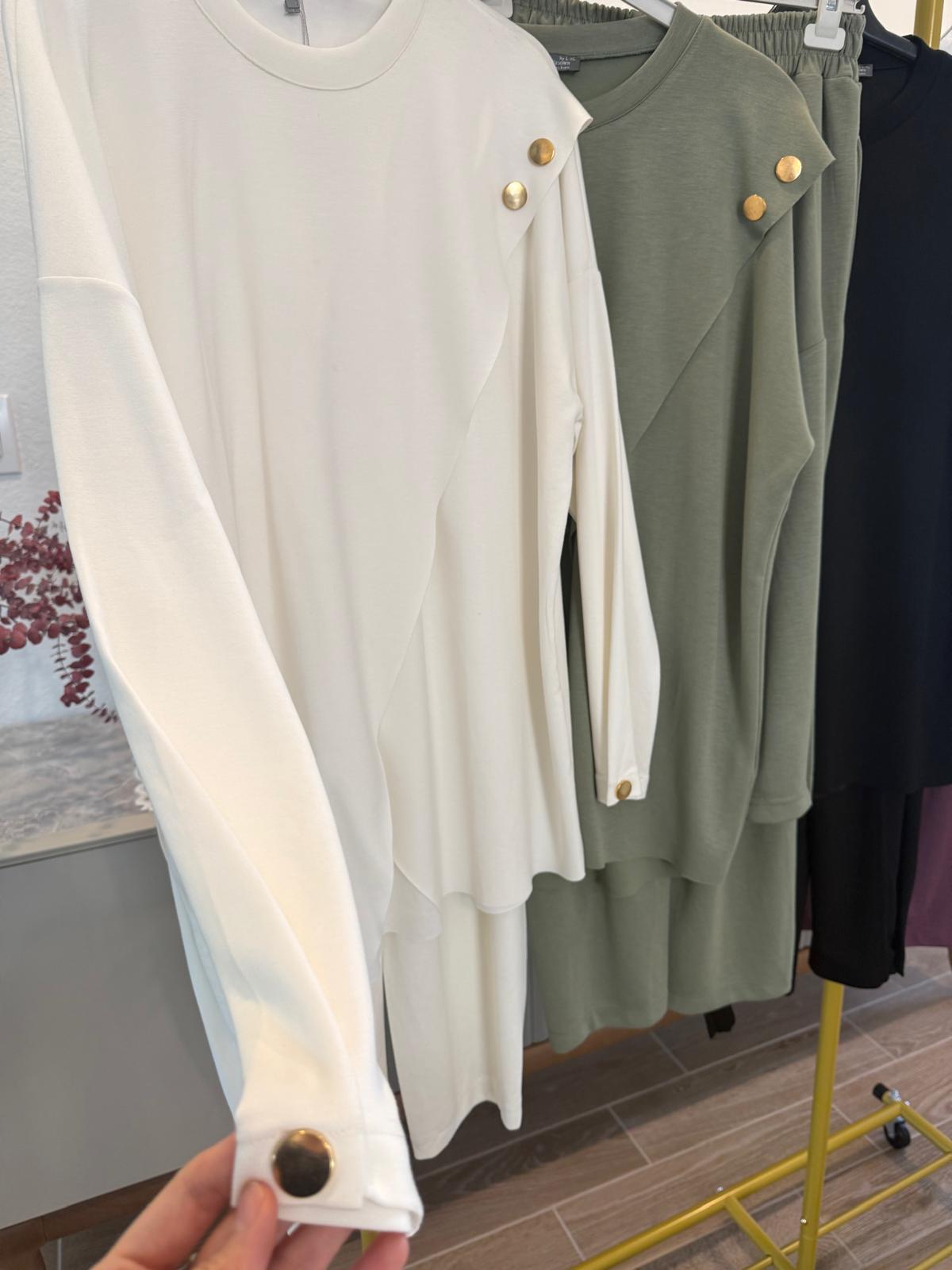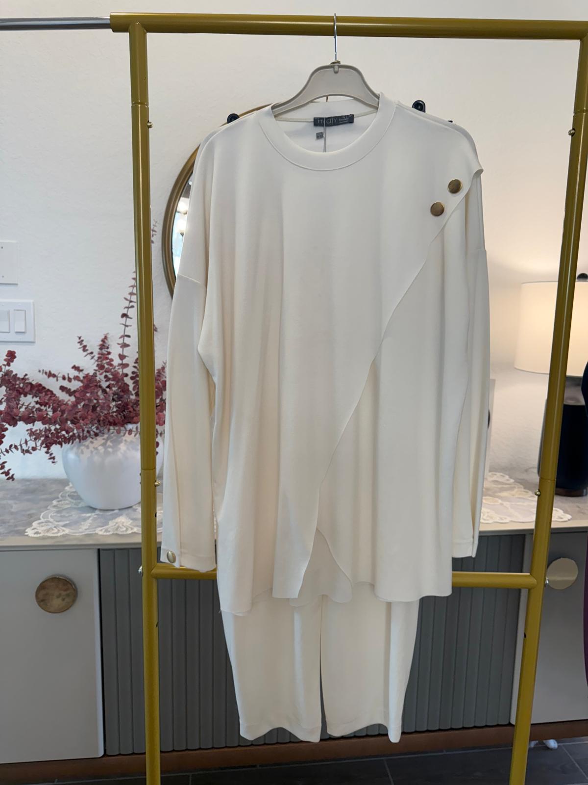 • Top: Long tunic-style blouse with an asymmetrical cut at the hem. Features button details on the shoulders and a layered look with a white underlay accent.