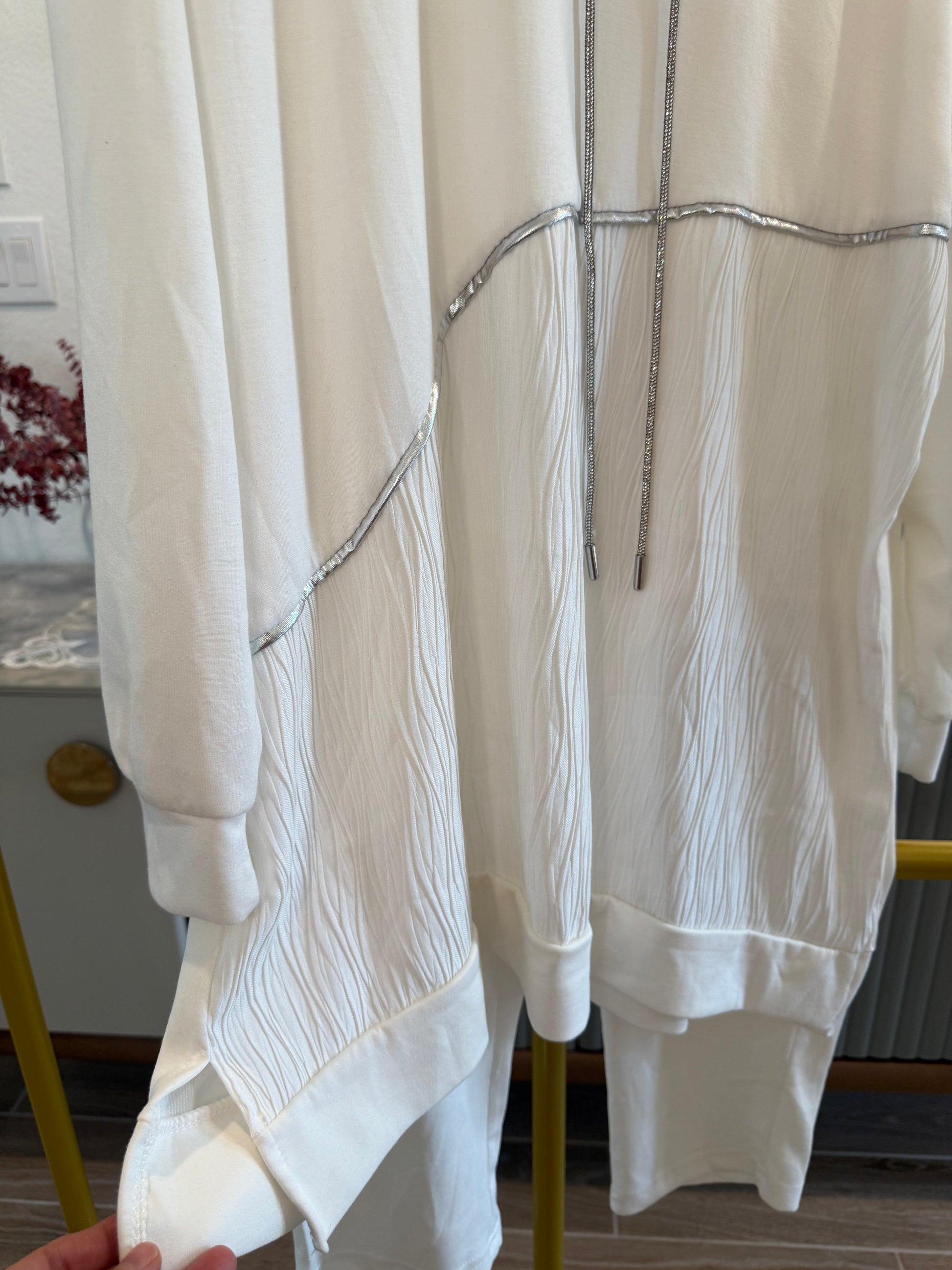 • Subtle silver trim highlighting the seam and drawstrings for a polished touch.