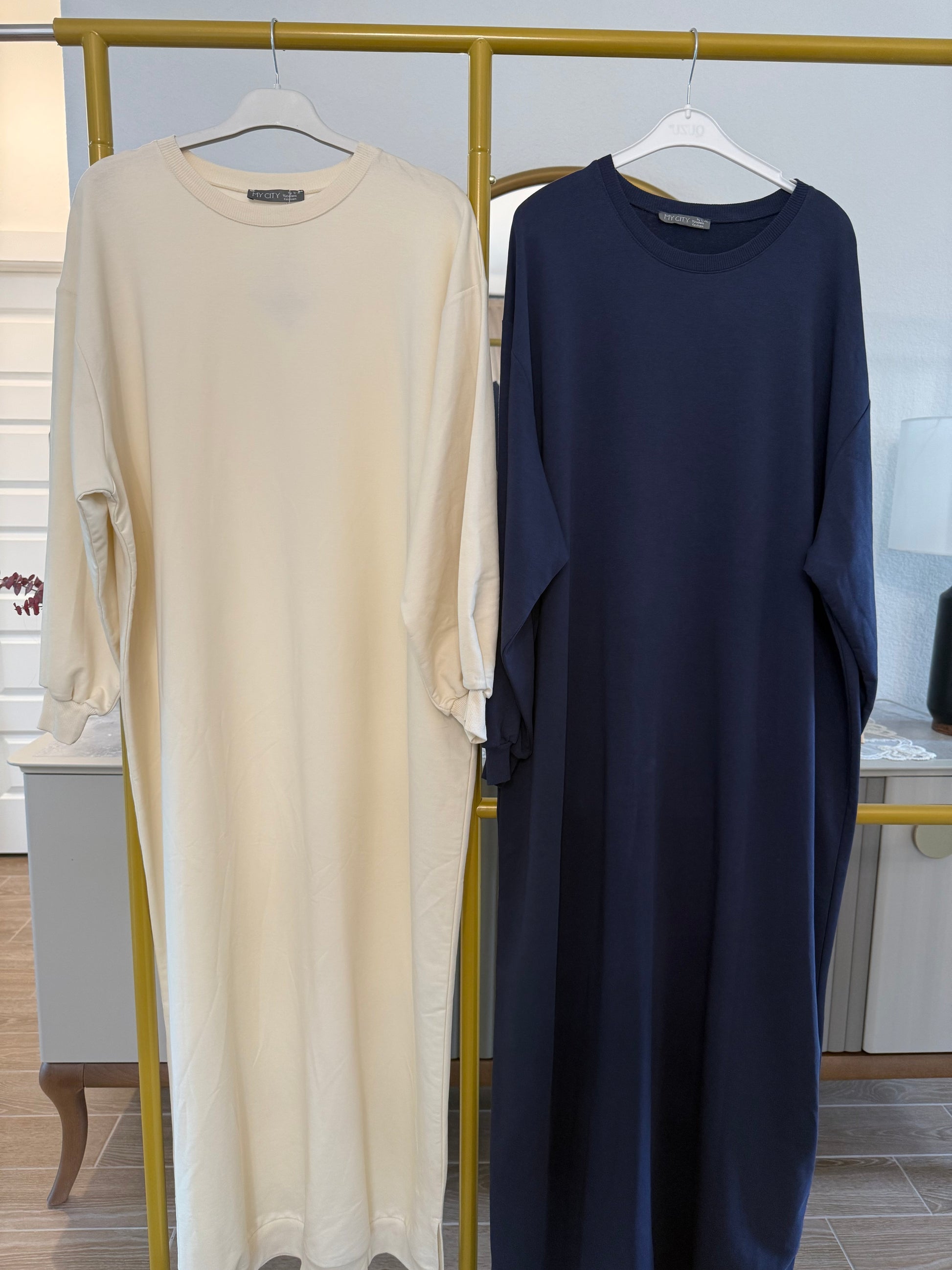 Long, casual cream maxi dress with a relaxed and minimal design.