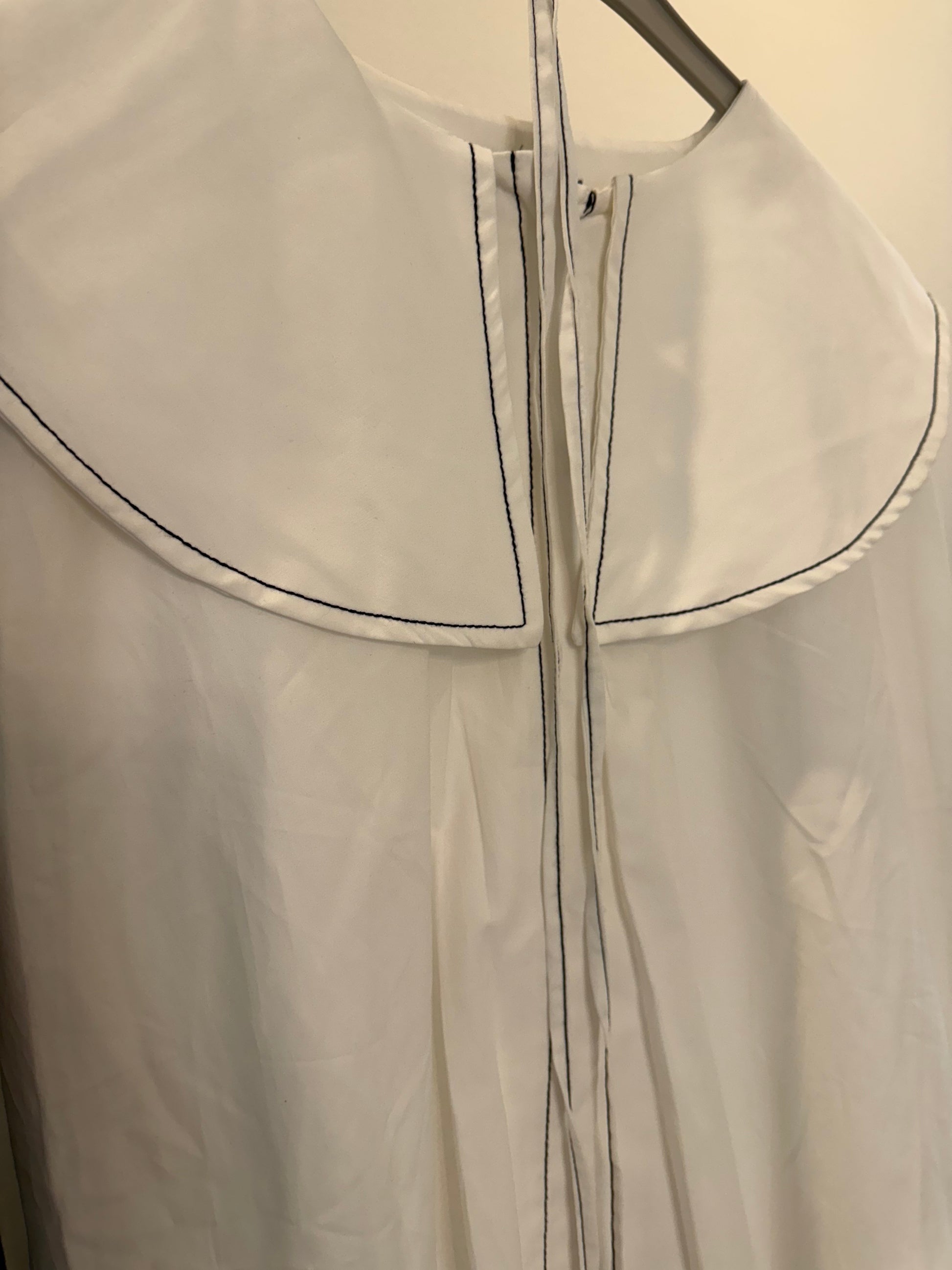 Collar: Statement oversized sailor collar with contrast piping along the edges.