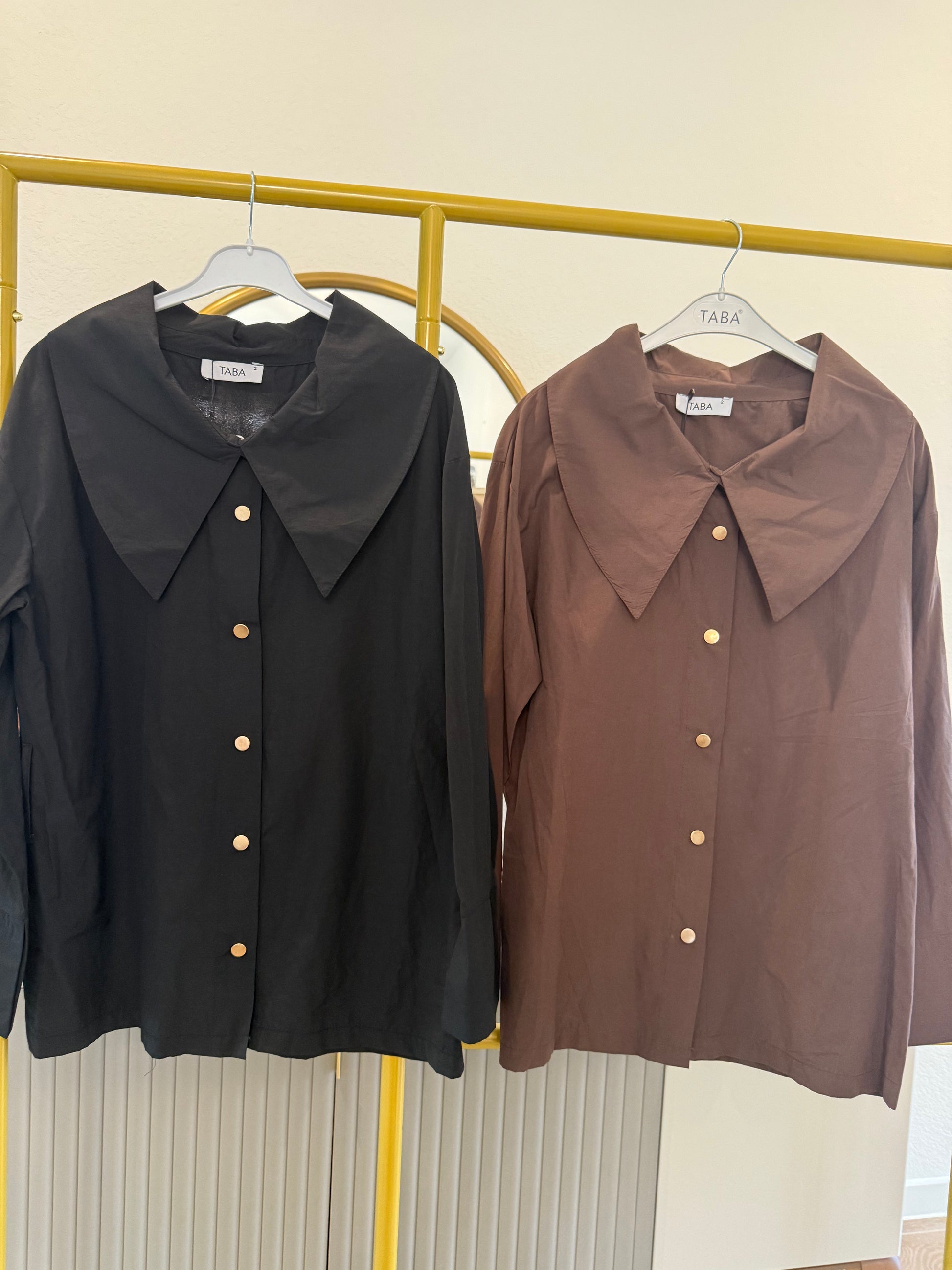 Long-sleeve button-down blouse with a bold oversized collar, adding a stylish twist to a modest classic.