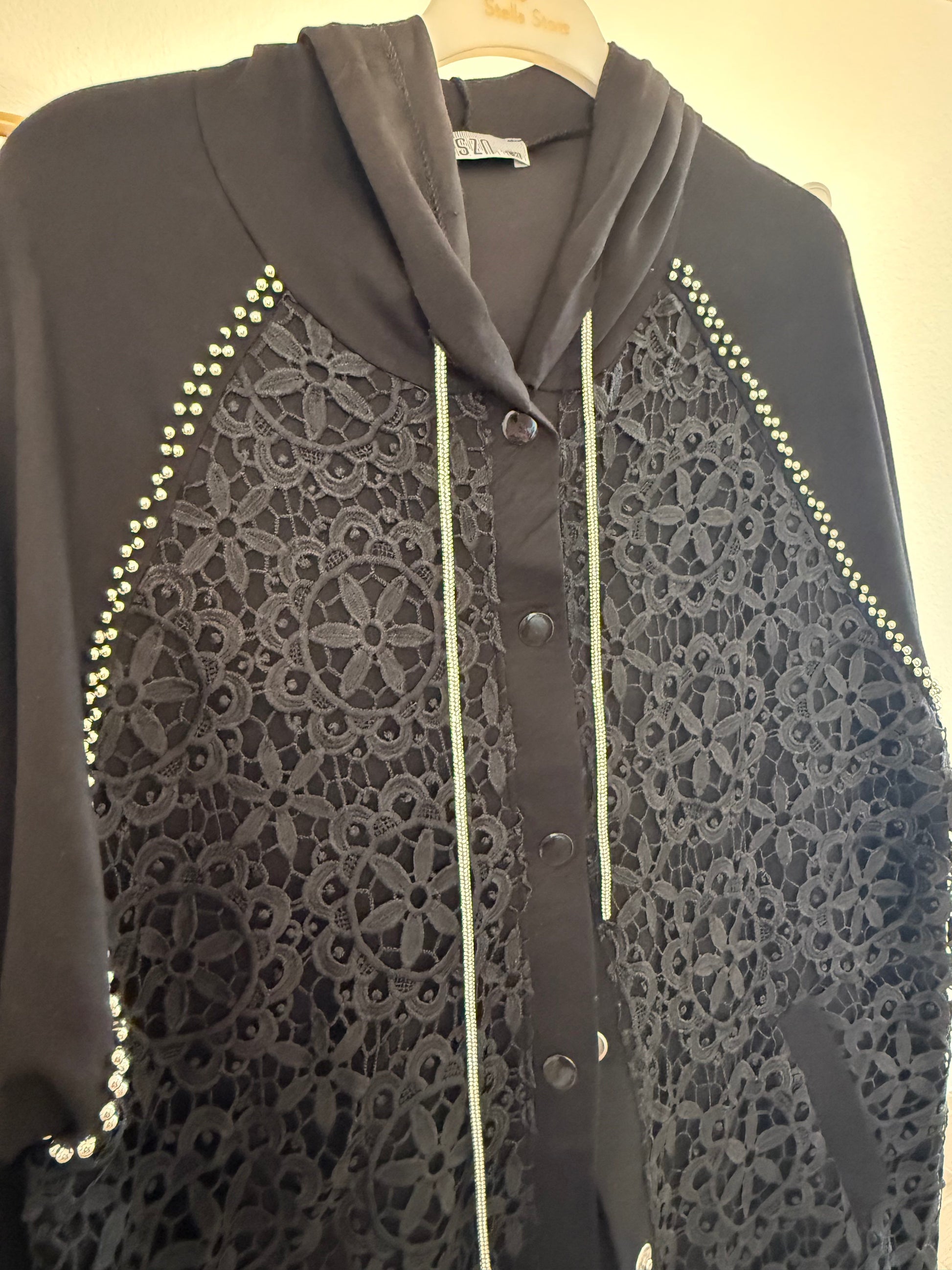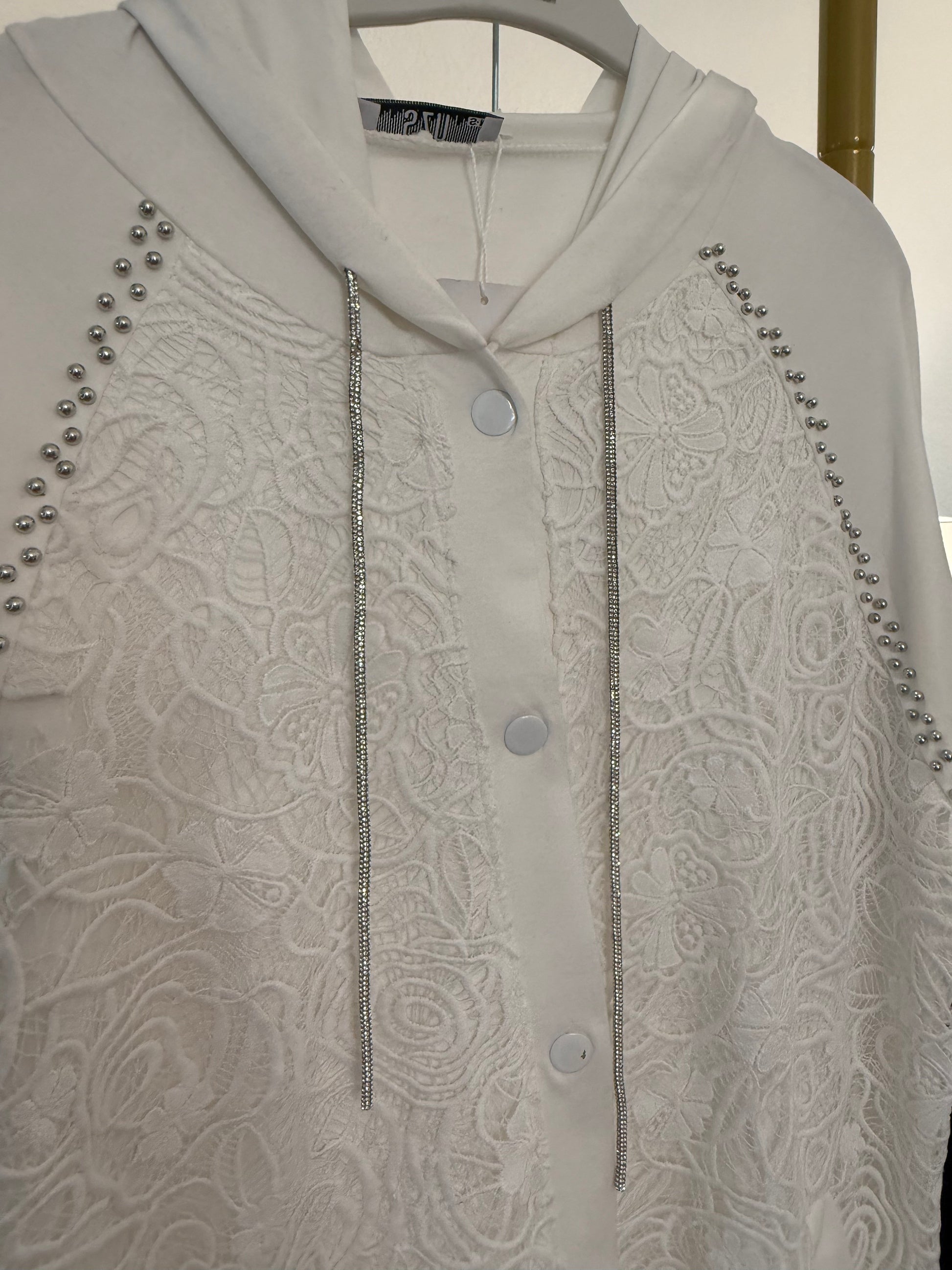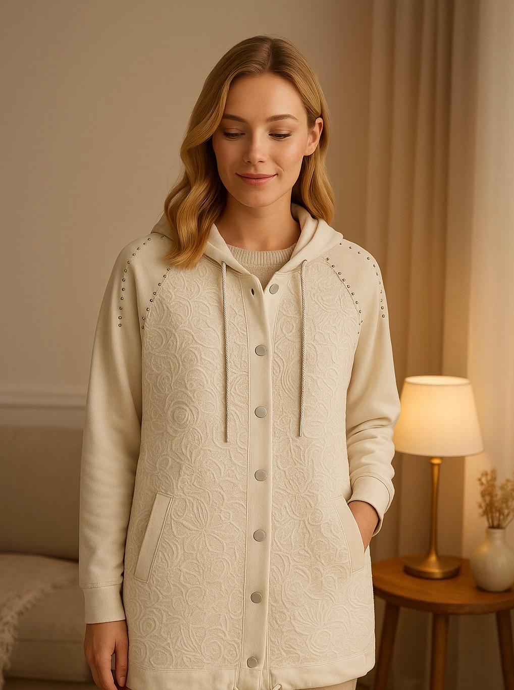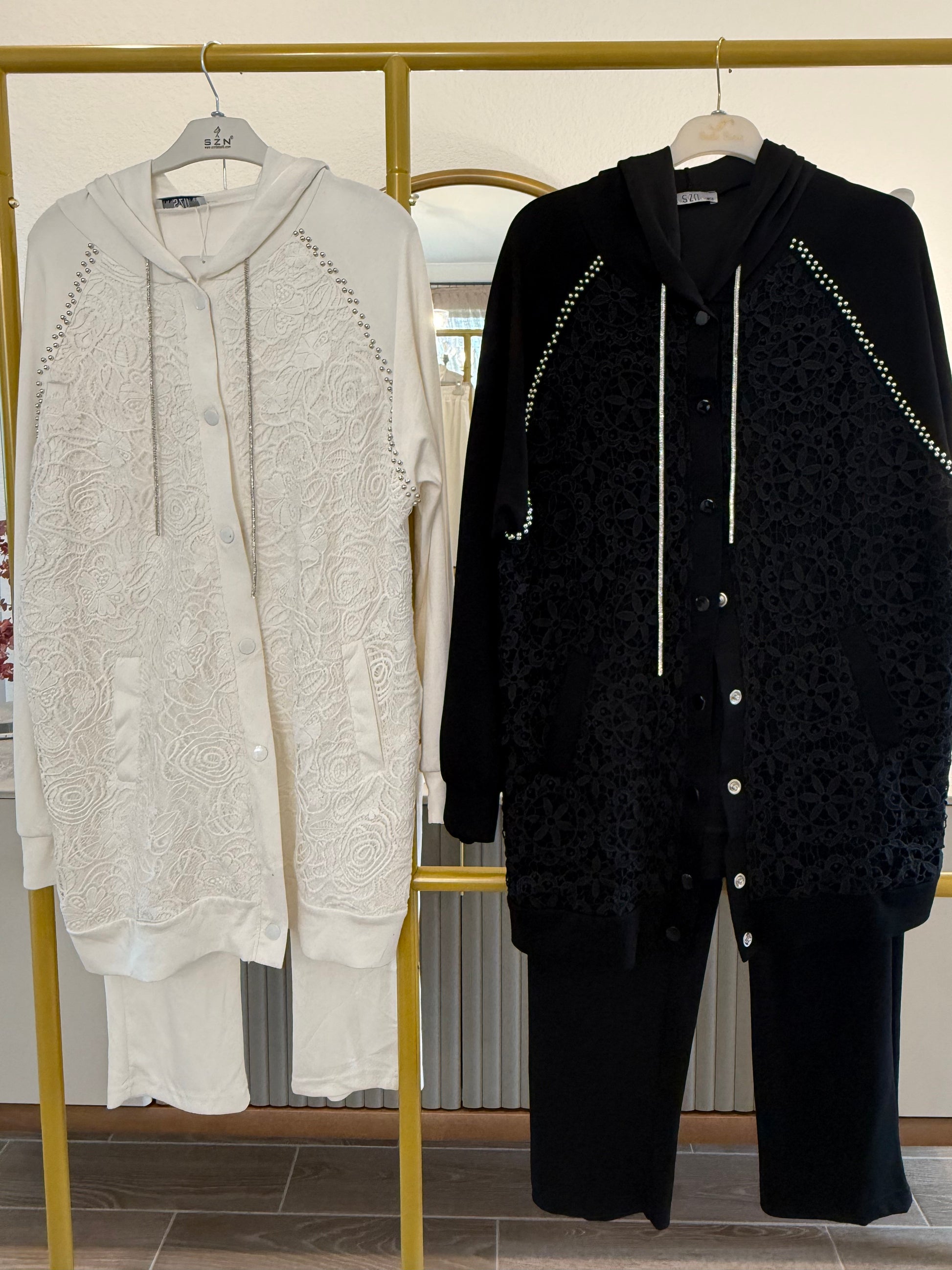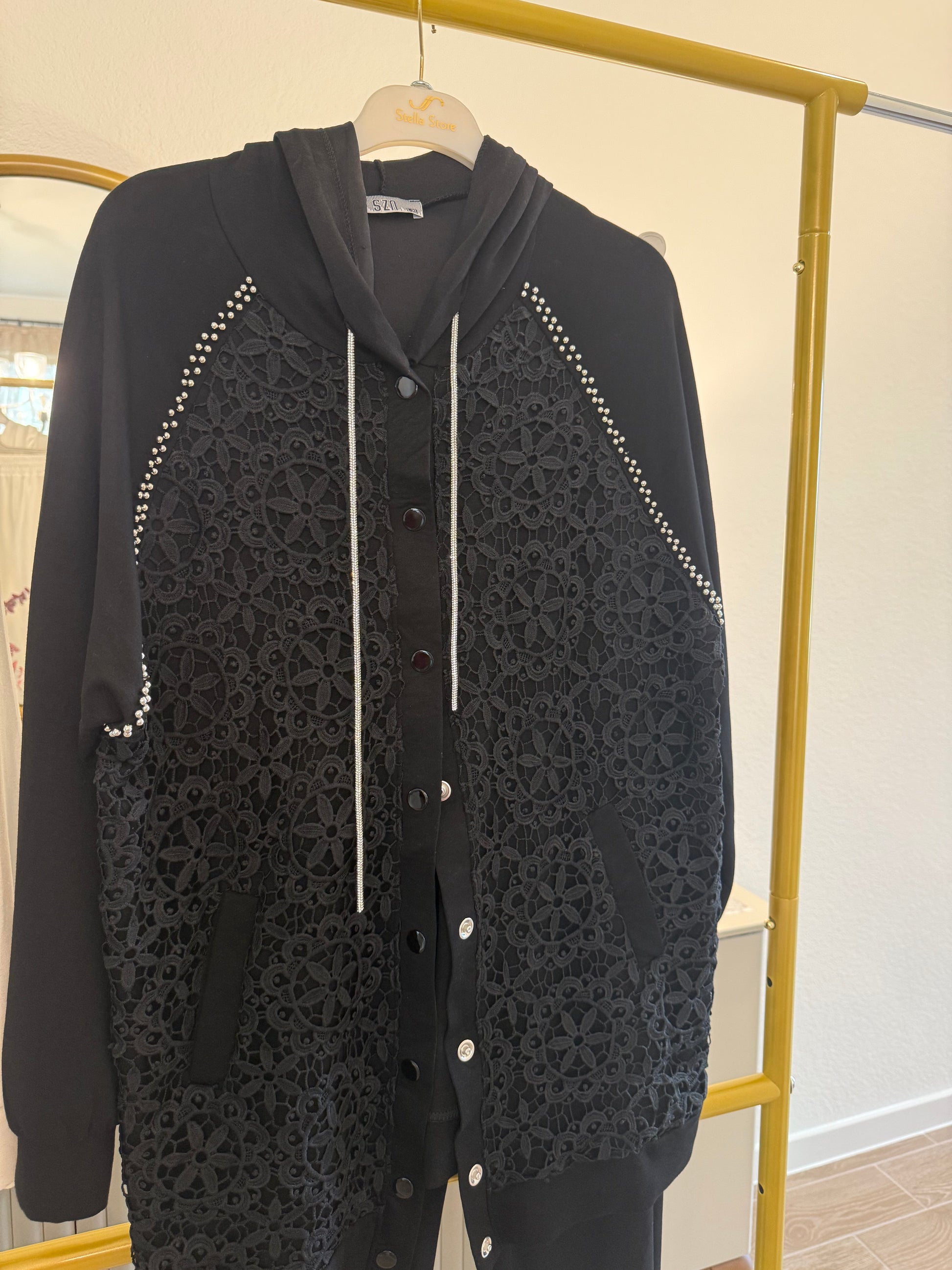 This two-piece set blends casual comfort (hoodie style) with elegance (lace embroidery & studs), making it versatile for both relaxed and semi-formal looks.