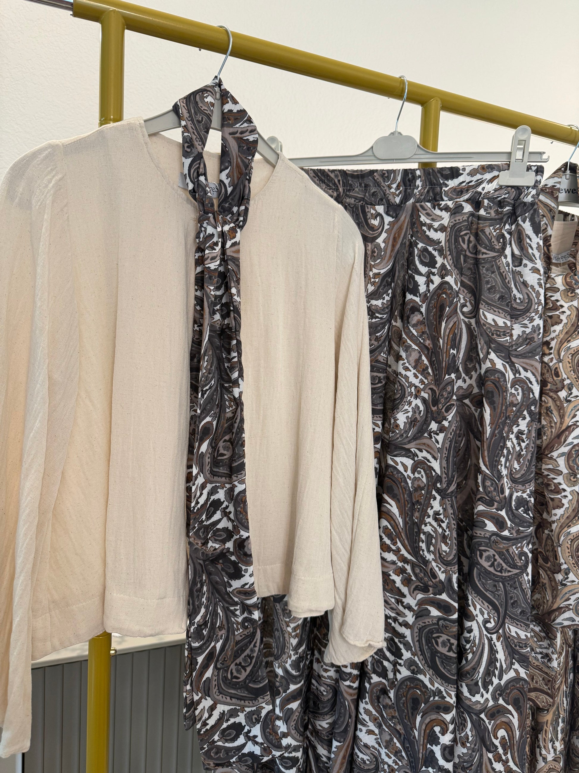 Soft cream-colored blouse with a lightweight, breathable fabric.