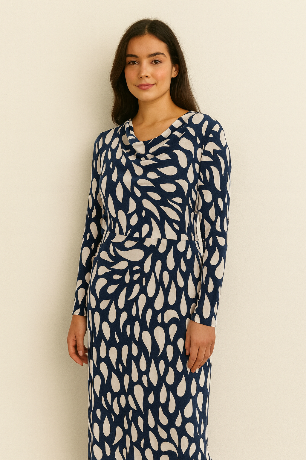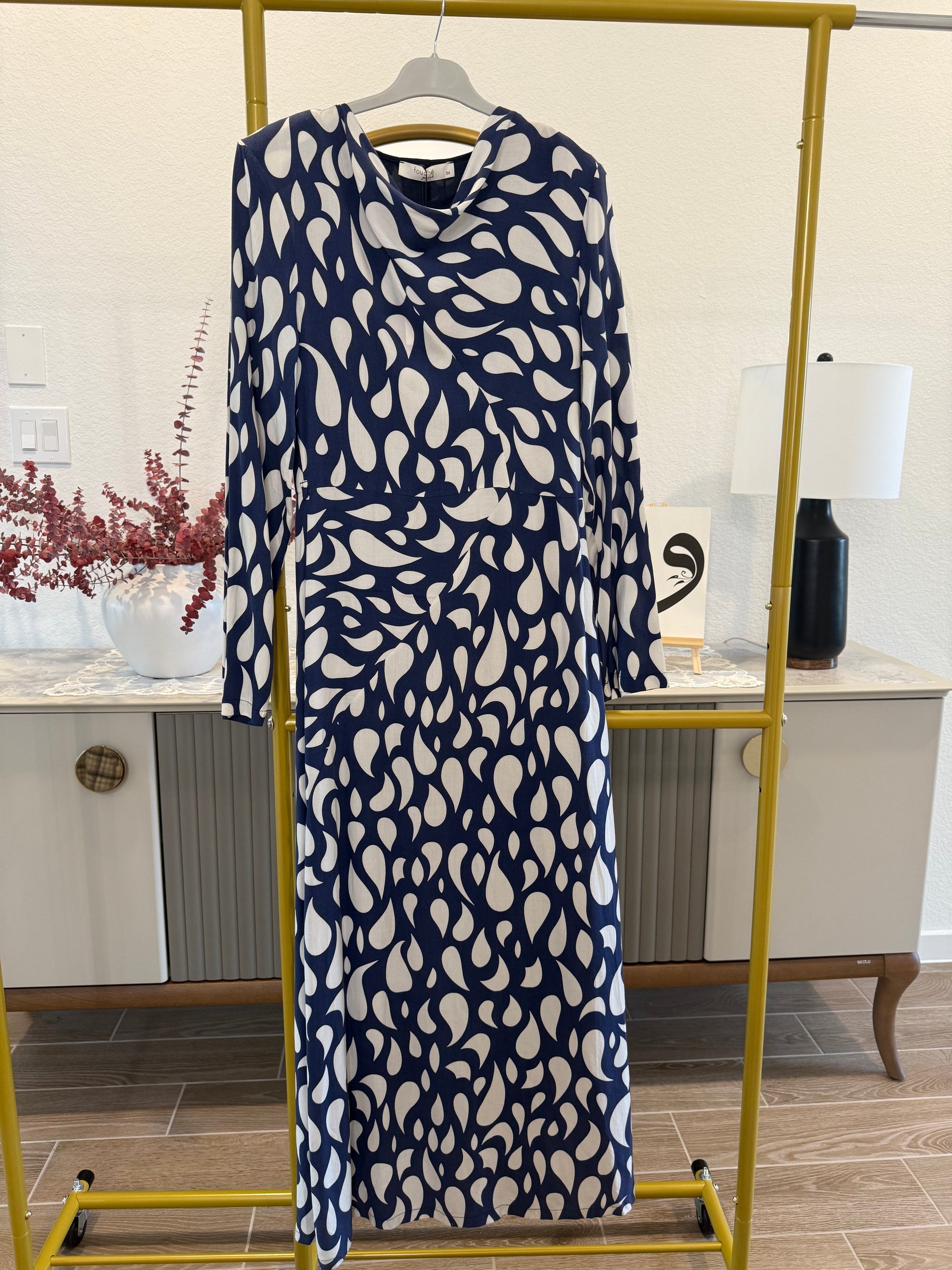 Color & Print: Navy blue base with large white abstract drop/teardrop shapes, creating a bold, eye-catching contrast.